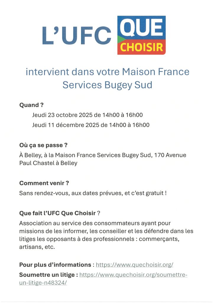 L’association UFC QUE CHOISIR intervient dans votre Maison France Services Bugey Sud. Quand ? Jeudi 23…