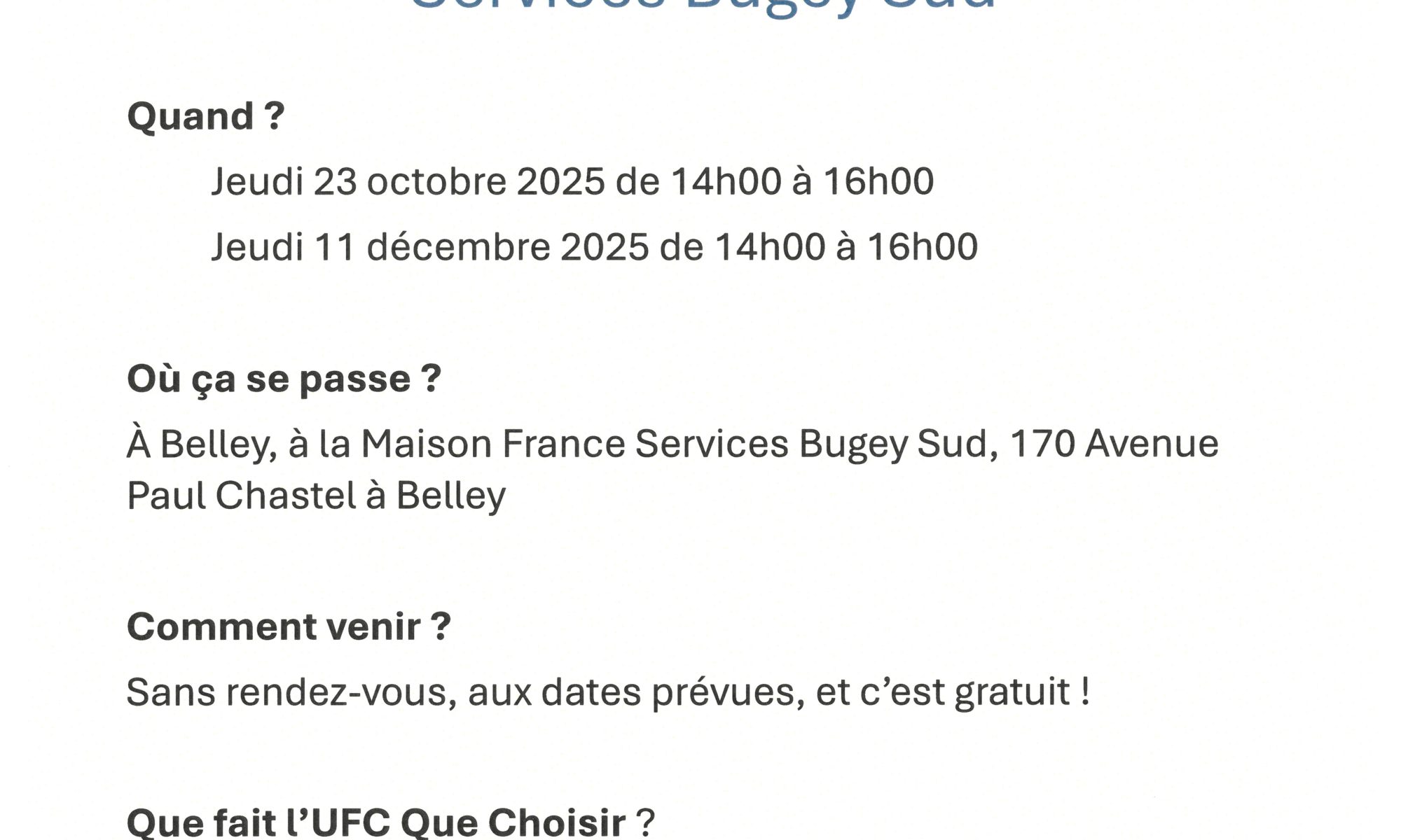 L’association UFC QUE CHOISIR intervient dans votre Maison France Services Bugey Sud.
